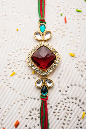 Indian festival: Raksha Bandhan background with an elegant Rakhi, Rice Grains and Kumkum. A traditional Indian wrist band which is a symbol of love between Brothers and Sisters.