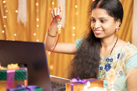 Indian Woman in tradition dress on video call or chat at Raksha Bandhan festival telling her brother to tie rakhi - Concept of distance relations, festival celebrations and technological lifestyle