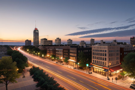 Dynamic city skyline at twilight with vibrant colors, representing urban life