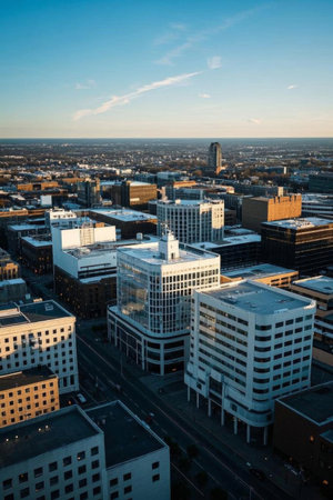 Captivating aerial view of an urban landscape showcasing modern buildings and busy streets, highlighting the dynamic life of city development and architecture.