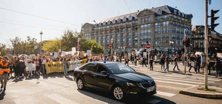 Strasbourg, France - Sep 21, 2019: Police Skoda car surveillance the protesters at worldwide climate march change started by Swedish climate activist Greta Thunberg