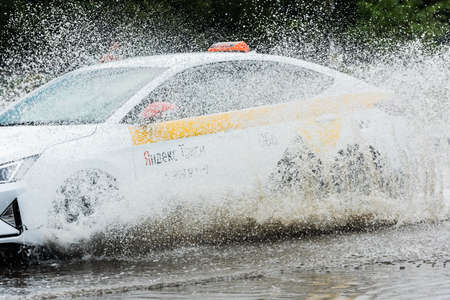 Russia. Moscow.May 30, 2020. A car drives through a pool of water with splashes. Spring flood in the city.