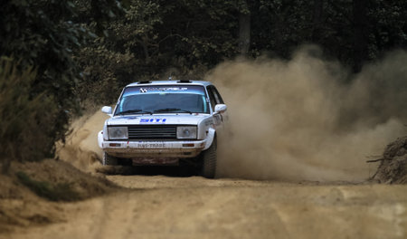 A rally car is speeding through a dirt road in a dense forest, leaving dust in its wake. Concept of adventure and motorsport