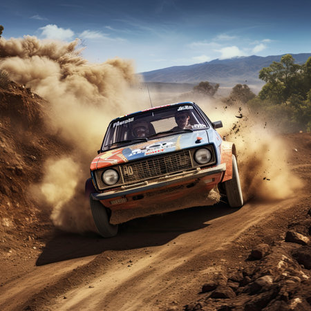 An abandoned car sits in the dirt, covered in a thick layer of dust, highlighting its neglect and lack of use, An action-packed scene from an off-road sport car race, AI Generated