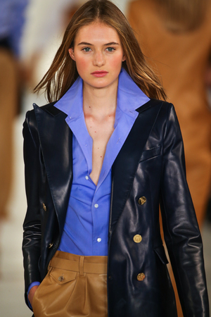 NEW YORK, NY - SEPTEMBER 11: A model walks the runway at Ralph Lauren during Mercedes-Benz Fashion Week Spring 2015 at Skylight Clarkson Sq on September 11, 2014 in New York City.