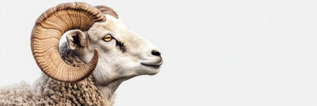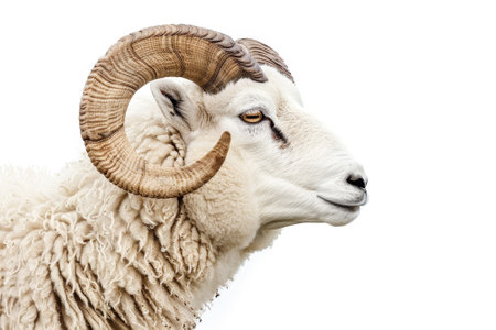 Bold ram with impressive curved horns showcases its textured wool and strong features in profile view, highlighting its unique characteristics and beauty.