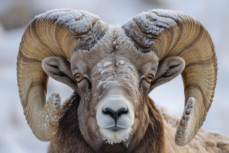 Close-up of a frost-covered bighorn sheep with curled horns against a snowy backdrop