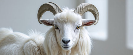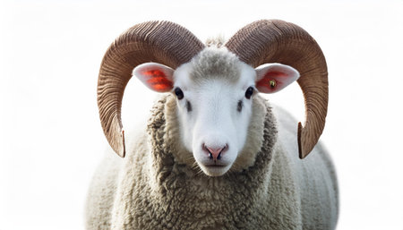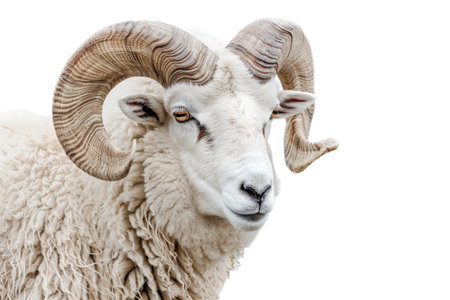 A beautiful ram showcases its impressive large curved horns and fluffy textured wool, perfectly posed against a clean white studio background.