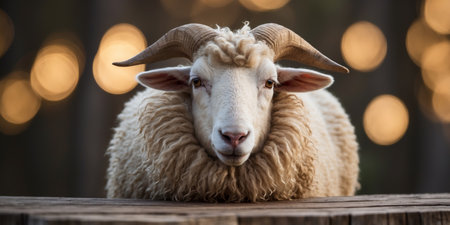 AI Generated. White Sheep with Large Horns Resting its Forelegs on a Wooden Plank