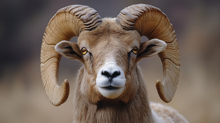 A striking close-up of a ram showcasing its impressive curved horns and expressive eyes, set against a blurred natural background that highlights its majestic presence.