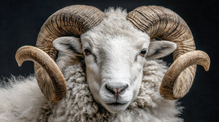 Close-up portrait of a majestic ram showcasing its impressive curved horns and striking features against a dark background, representing wildlife's beauty and strength.