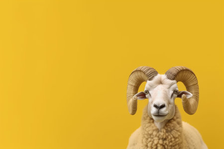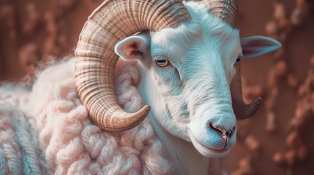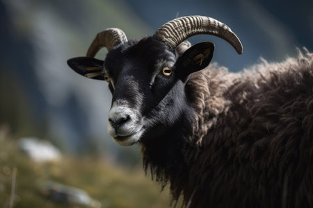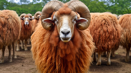 a sheep with large horns stands prominently, showcasing its distinct facial features. this captivating wildlife photograph, captured in a precisionist style, showcases the sheep's unique characteristics. the image, taken with iso 200, is of ultra-high definition quality, displaying the sheep's beige and amber tones. this stunning photograph can be found on flickr. ai generated