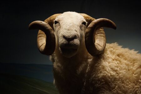 An intimate view of a majestic, snow-white sheep's face, highlighting its elaborate curled horns and thick fleece, set against a deep, shadowy backdrop.