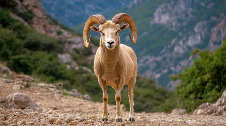 A stunning horned ram stands confidently on a rocky pathway, surrounded by a serene mountain landscape, showcasing the beauty of wildlife in its natural habitat.