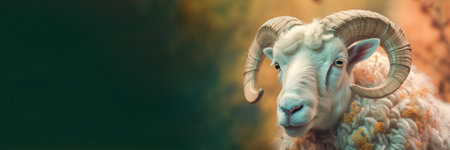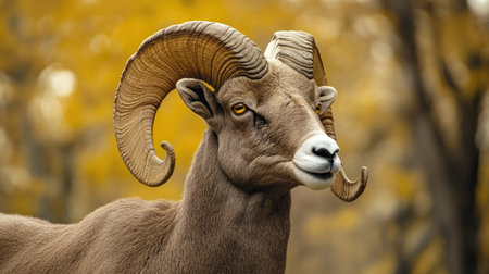 A close-up portrait of a majestic ram with impressive curved horns set against a stunning autumn backdrop. This serene wildlife image captures the beauty of nature.