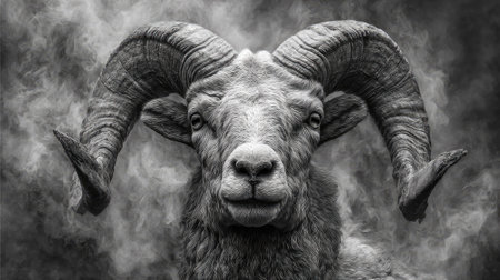 This black and white image features a ram with prominent curved horns. The ram's face is centered, displaying detailed textures in its fur and horns. The background presents a smoky, indistinct environment. This photograph could be used for various editorial and commercial applications.