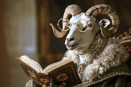 A whimsical ram character wearing glasses and holding a book, portraying a scholarly and intellectual look.