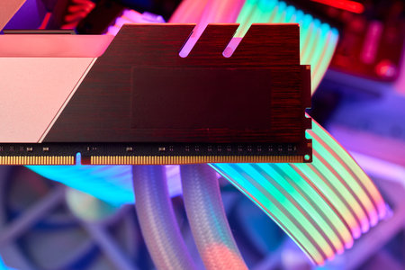 Enhancing Performance: Close-up of Modern Computer Motherboard with DDR5 RAM DIMM Slots