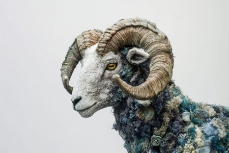 Profile view of a striking frame featuring large, curved horns and textured wool, captured in a studio environment with a clean white background.