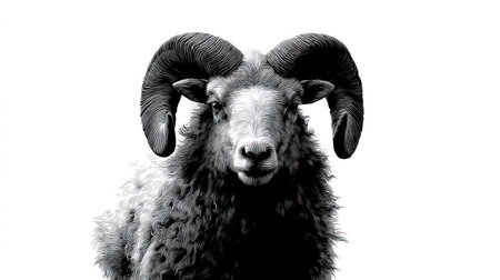This image showcases a ram, distinguished by its impressive horns, set against a bright, neutral background. The monochromatic rendering emphasizes texture and form, creating a striking contrast. Ideal for graphic design, advertising, or editorial content, this visual offers a strong aesthetic appeal that could be used for various projects.