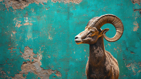 This striking portrait captures a majestic ram set against a vividly weathered turquoise wall. The intricate textures and rich colors enhance the serene gaze and powerful presence.