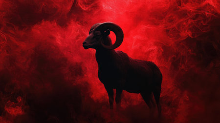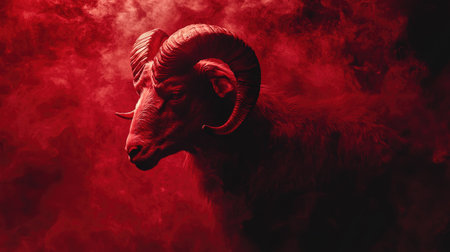 A powerful ram's silhouette stands tall against swirling red smoke, evoking mystery and strength.