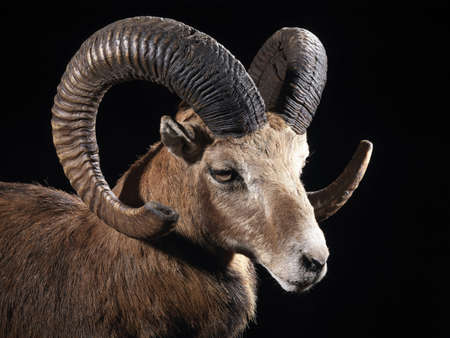 Stuffed specimen of Mouflon (Ovis musimon) with black background
