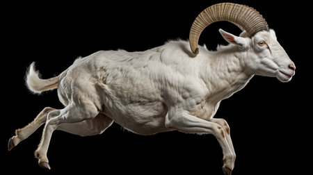 A ram with horns is walking on a white background. The ram has a curious expression on its face