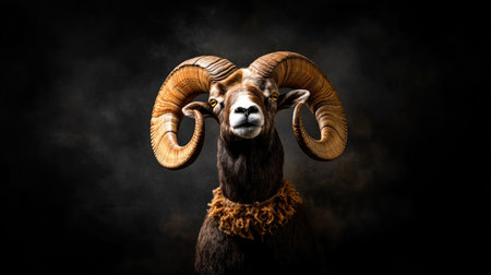 A stunning portrait of a ram showcasing its impressive horns and detailed fur, set against a dark, dramatic background. This image captivates with its majestic presence.