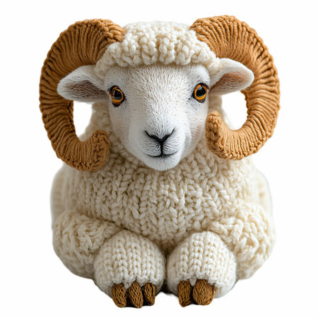 This rams large curved horns and textured wool pop against a clean white background, creating a striking visual profile.