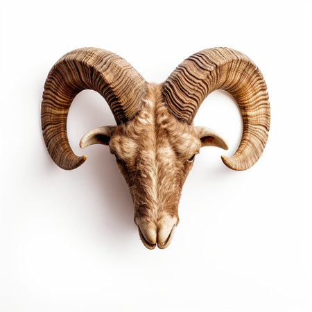 Detailed Front View of a Majestic Brown Ram Head with Impressive Horns on a White Background