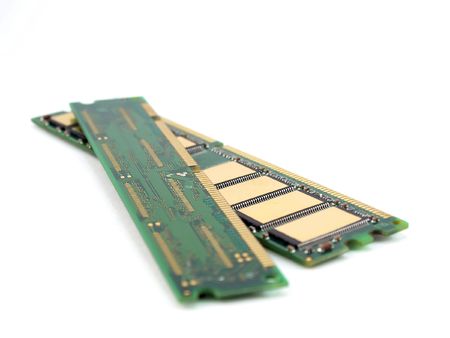 Computer RAM memory. Random Access Memory on white background. Operative memory for notebook, laptop, computer, monoblock. Closeup, selective focus.