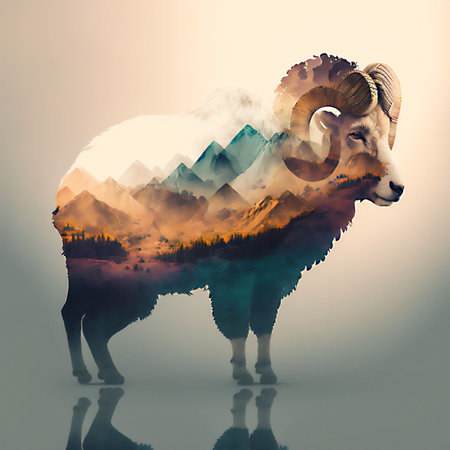 An AI generated illustration of double-exposure mouflon with landscape