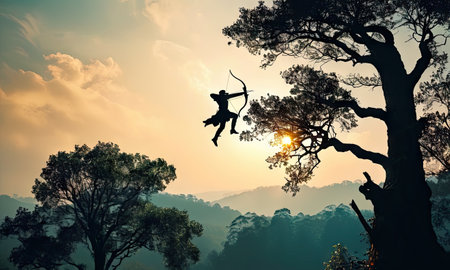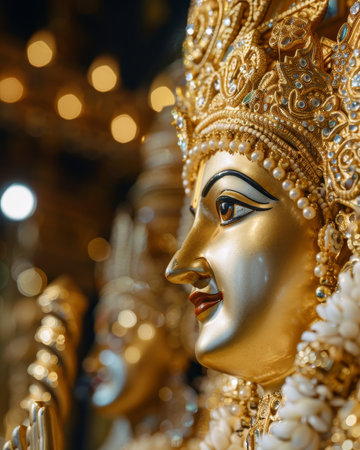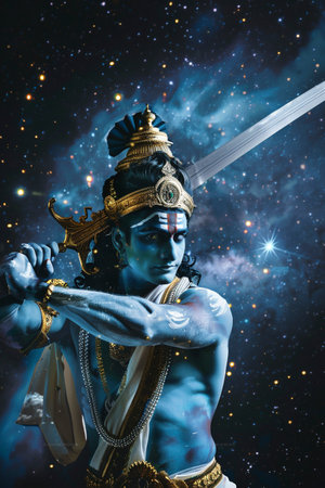 A serene image of Lord Rama holding his bow, with soft light illuminating the intricate details of the statue.
