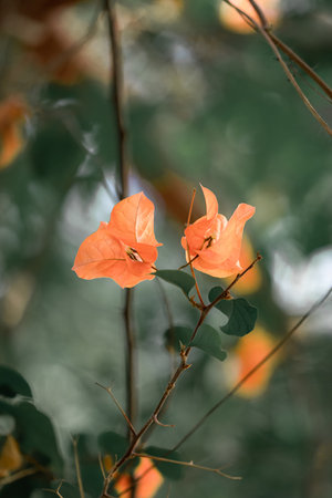 A branch bearing vibrant orange flowers is set against a serene, clear blue background. The image showcases natural elements with a focus on color and texture. Its composition and lighting suggest outdoor conditions, ideal for commercial uses promoting nature or botanical themes.