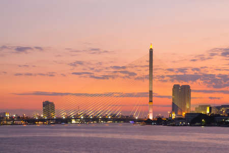 View of Bangkok skyline and beautiful bridge panorama at Chao Phraya River Bangkok Thailand at sunset. Maha Chesadabodindranusorn Bridge is a bridge Nonthaburi District in Nonthaburi Province.