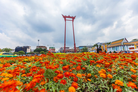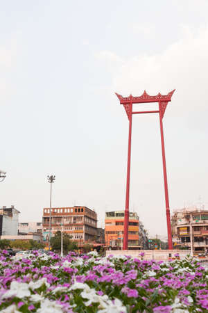 Red Giant Swing landmark and tourist main sightseeing in Bangkok,Thailand.Photo design in banner cover size with copy space for add text.