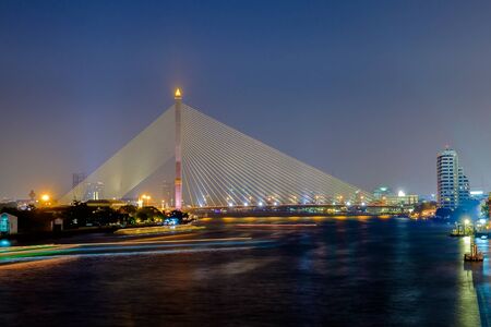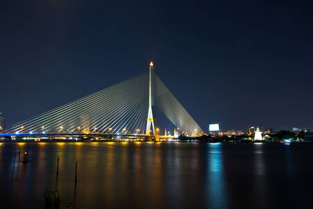 Night View of the Rama VIII Bridge, a Cable-stayed Bridge Crossing Chao Phraya River which Named after the Late King Ananda Mahidol, Bangkok, Thailand