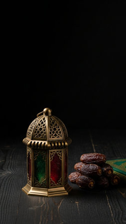 Black lantern and dates fruit on dark background for the Muslim feast of the holy month of Ramadan Kareem.