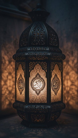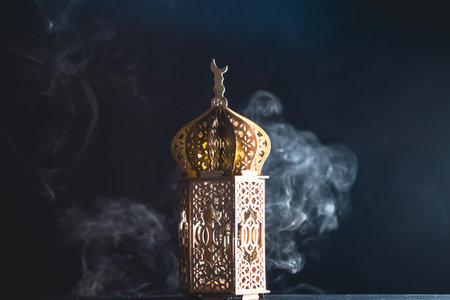 Ramadhan lamp with Islamic rosary beads on dark background