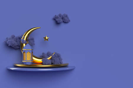 Ramadan Kareem greeting template with Arabic lantern, moon, gift, presents and stars. Podium, stand on holiday light background for advertising products - 3d render illustration for cards, greetings.