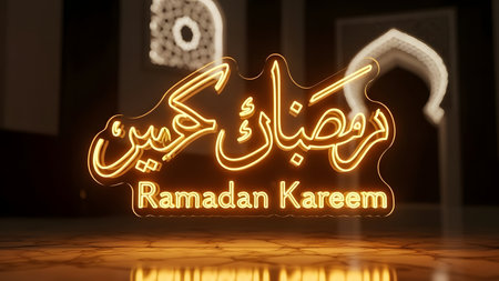 Ramadan Kareem greeting card in neon style. 3D rendering