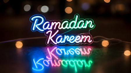 A vividly illuminated Ramadan Kareem neon sign stands prominently, showcasing a dynamic interplay of blue, green, and pink light. The vibrant glow creates a stunning reflection on a sleek, reflective surface below, enhancing the festive atmosphere. In the blurred background, soft, warm bokeh lights add depth and a celebratory mood, evoking the essence of the holy month. This modern and vibrant visual captures the true spirit of Ramadan, representing greetings, blessings, and communal joy. It's ideal for conveying messages of peace, reflection, and cultural celebration during Islamic observances. The artistic lighting and elegant calligraphy offer a contemporary take on traditional themes.