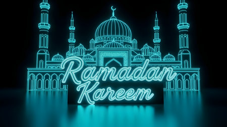 A vibrant and modern digital illustration featuring a neon blue outline of a mosque with prominent minarets and domes, set against a reflective surface that enhances its luminous glow. In the foreground, the elegant cursive text 'Ramadan Kareem' shines in matching neon blue, creating a festive and reverent atmosphere. This striking imagery symbolizes the spiritual essence of Ramadan, the Islamic holy month of fasting, prayer, and reflection. It evokes feelings of peace, blessings, and cultural celebration, perfect for greeting cards, social media posts, event invitations, or any design project requiring a contemporary Islamic theme. The minimalist yet impactful design merges traditional motifs with a futuristic aesthetic, offering a unique visual for expressing goodwill and faith during this sacred period, honoring Islamic holidays and spiritual observances with style and reverence.