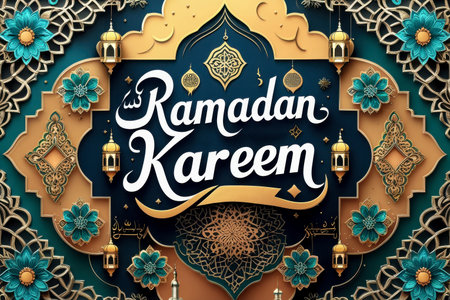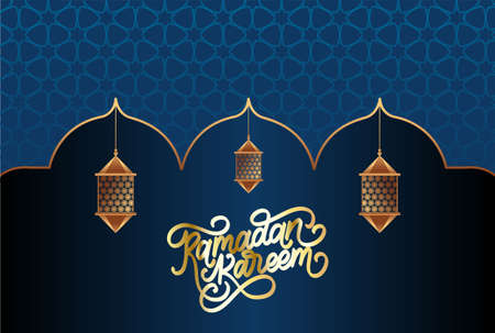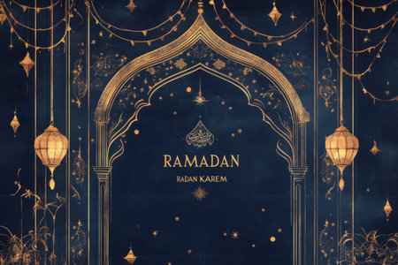 A dark blue backdrop features an ornate golden archway, intricate patterns, and glowing lanterns, evoking a festive Ramadan atmosphere.
