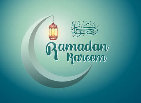 Ornamental Arabic lantern with crescent moon glowing at night. Festive greeting card for Muslim holy month Ramadan Kareem.