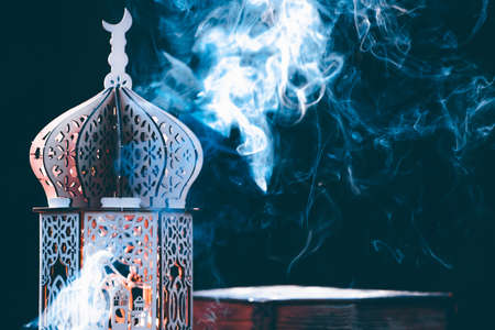 Ornamental Arabic lantern on blue background with copy space. Festive greeting card for Muslim holy month Ramadan Kareem.