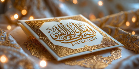 Golden Arabic calligraphy on Quran resting on embroidered fabric with lights in a cozy setting at night