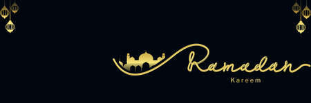 Ramadan Kareem background with mosque and golden arabic lanterns