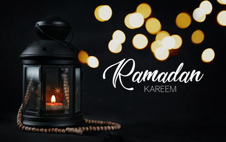 Ramadan Kareem Greeting Typography Beautiful Bokeh. Ramadan Candle Lantern with Wooden Prayer Beads